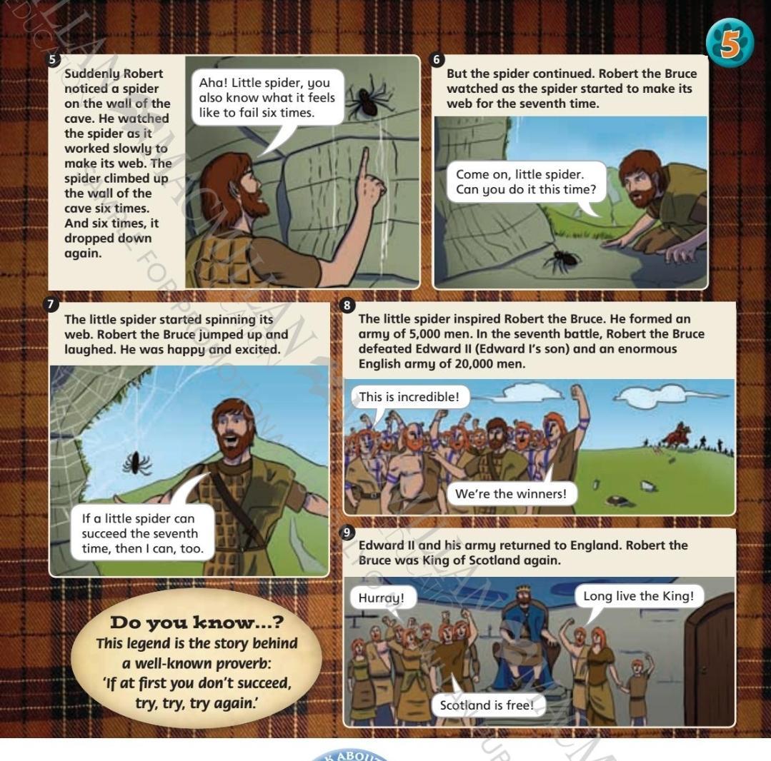 Lesson 3 Read the story and write the answers. (See Student's Book page 46.) Ask and say. Picture 1: Who was Robert the Bruce? He was King of Scotland. Picture 2: Who defeated Robert the Bruce in six battles? Picture 3: Why was Robert the Bruce disappointed? Picture 4: Where did Robert the Bruce live? Picture 5: How many times did the spider climb up the wall? Picture 6: What did the spider start to do for the seventh time? Picture 7: What did Robert the Bruce do? Picture 8: How big was the Scottish army? Picture 9: What did Edward II and the English army do? hannonos