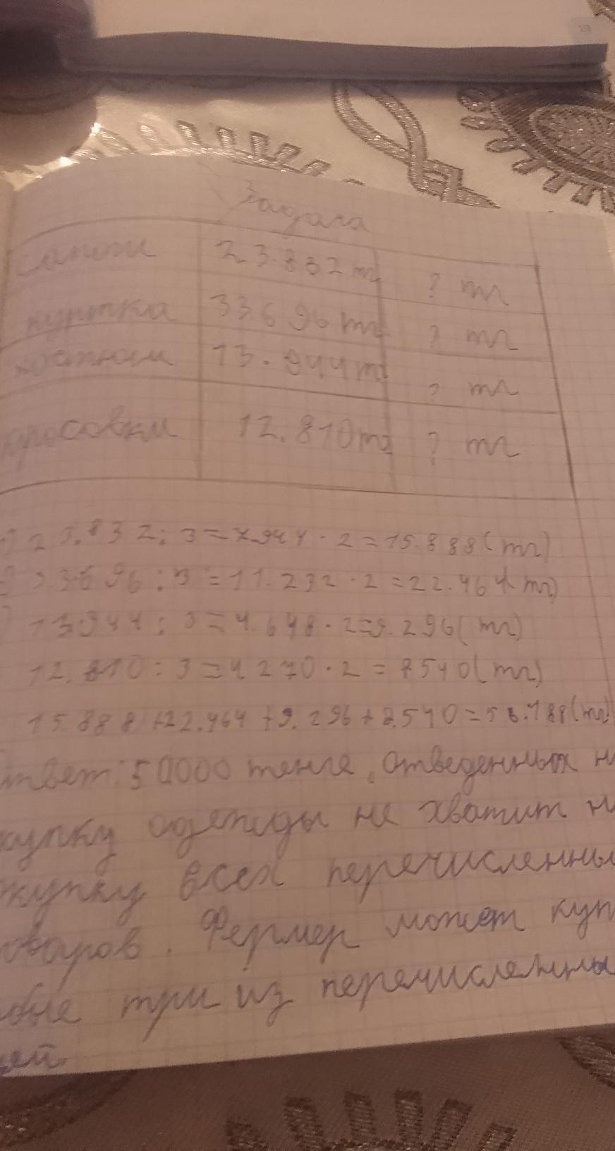 Реши задачу. Наименование товара Сапоги Влияние климата на хозяйственную де 4 Фермер сдал урожай, купил всё необходимое для посадки на следующий год. Затем решил купить одежду. На сезонНОЙ распродаже все товары стали стоить дешевле на треть от пер воначальной цены. Вычисли новую цену товаров. Куртка Костюм Кроссовки МАТЕМАТИКА В ЖИЗНи Первоначальная цена 23 832 тенге 33 696 тенге 13 944 тенге 12 810 тенге Новая цена ПОМОГИ Фермеру посчитать, что он сможет купить, если на одежду было отведено 50 000 тенге. дам 29баллов