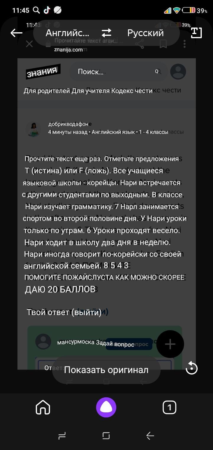 Read the text again. Mark the sentences T (true) or F (false). All students at the language school are Korean. Nari meets other students at the weekends. In class, Nari studies grammar. 7 Narl does sports in the afternoons. Nari only has lessons in the morning. 6 The lessons are fun. Nari goes to school two days a week. Nari sometimes speaks Korean to her English family. 8 5 4 3 ПОМОГИТЕ ПОЖАЙСЛУСТА КАК МОЖНО СКОРЕЕ ДАЮ 20 БАЛЛОВ