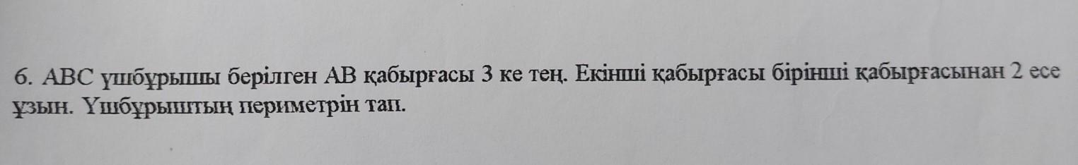 30 БАЛЛ АВС үшбұрышы берілген АВ қабырғасы 3 ке тең. Екінші қабырғасы бірінші қабыргасынан 2 есе ұзын. Үшбұрыштың периметрін тап