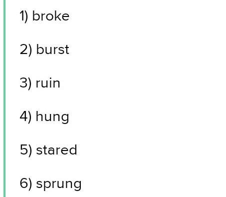 Complete the sentences. Use: stared, ruin, burst, broke, hung, sprung. .... the silence. from the hound's mouth. ..... Holmes' plan. .... over the moor. helplessly as the hound 1 A strange sound ...broke..... 2 Fire ...burst... 3 The weather could ...ruin . 4 The fog..hung .... 5 He...stared .... ran at him. 6 The hound.....spring. out from the fog.