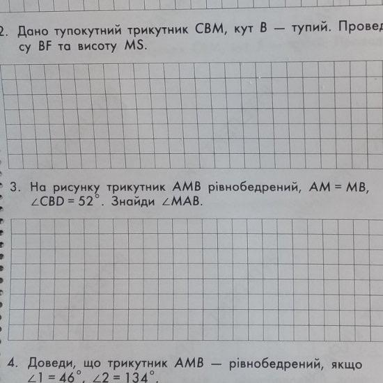 3. На рисунку трикутник AMB рівнобедрений, AM=MB, кут CBD=52 градуси. Знайди кут MAB