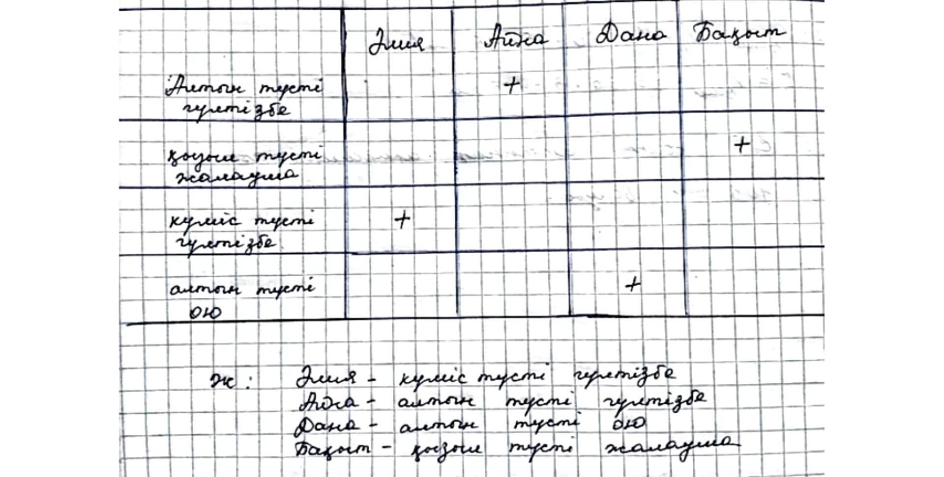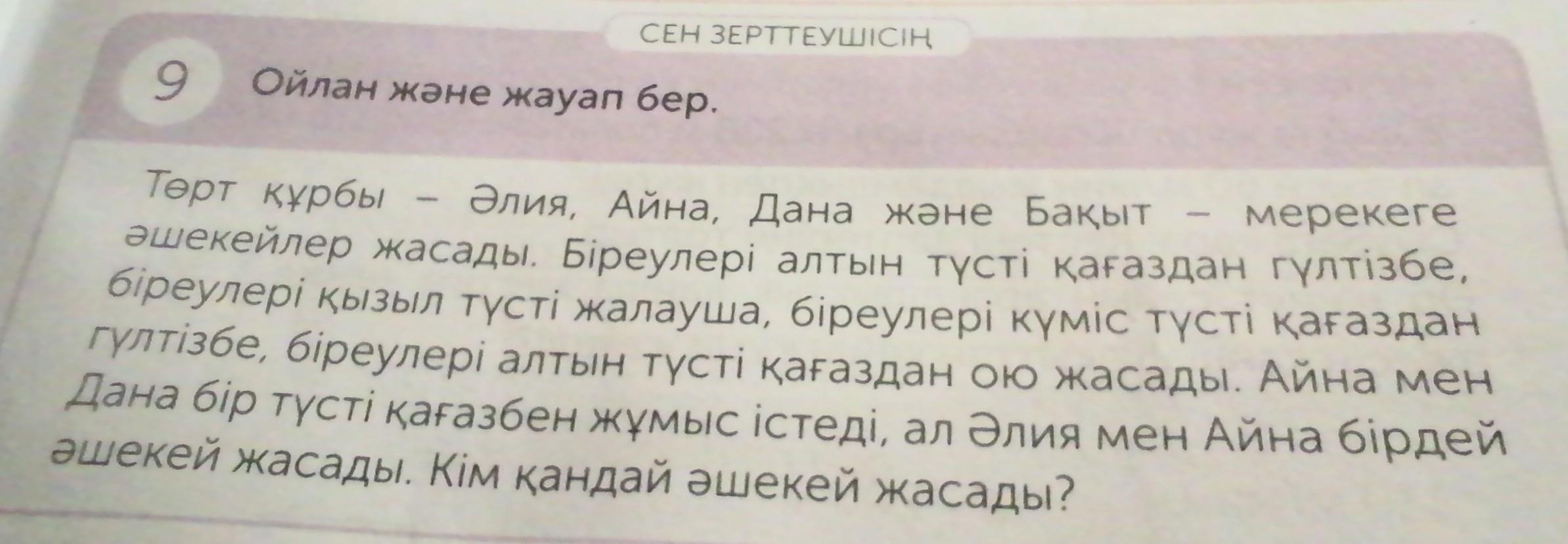 СЕН ЗЕРТТЕУШІСІҢ 9 Ойлан және жауап бер. Төрт құрбы Әлия, Айна, Дана және Бақыт - мерекеге эшекейлер жасады. Біреулері алтын түсті қағаздан гүлтізбе, іреулері қызыл түсті жалауша, біреулері күміс түсті қағаздан елтізбе, біреулері алтын түсті қағаздан ою жасады. Айна мен на бір түсті қағазбен жұмыс істеді, ал Әлия мен Айна бірдей екей жасады. Кім қандай әшекей жасад