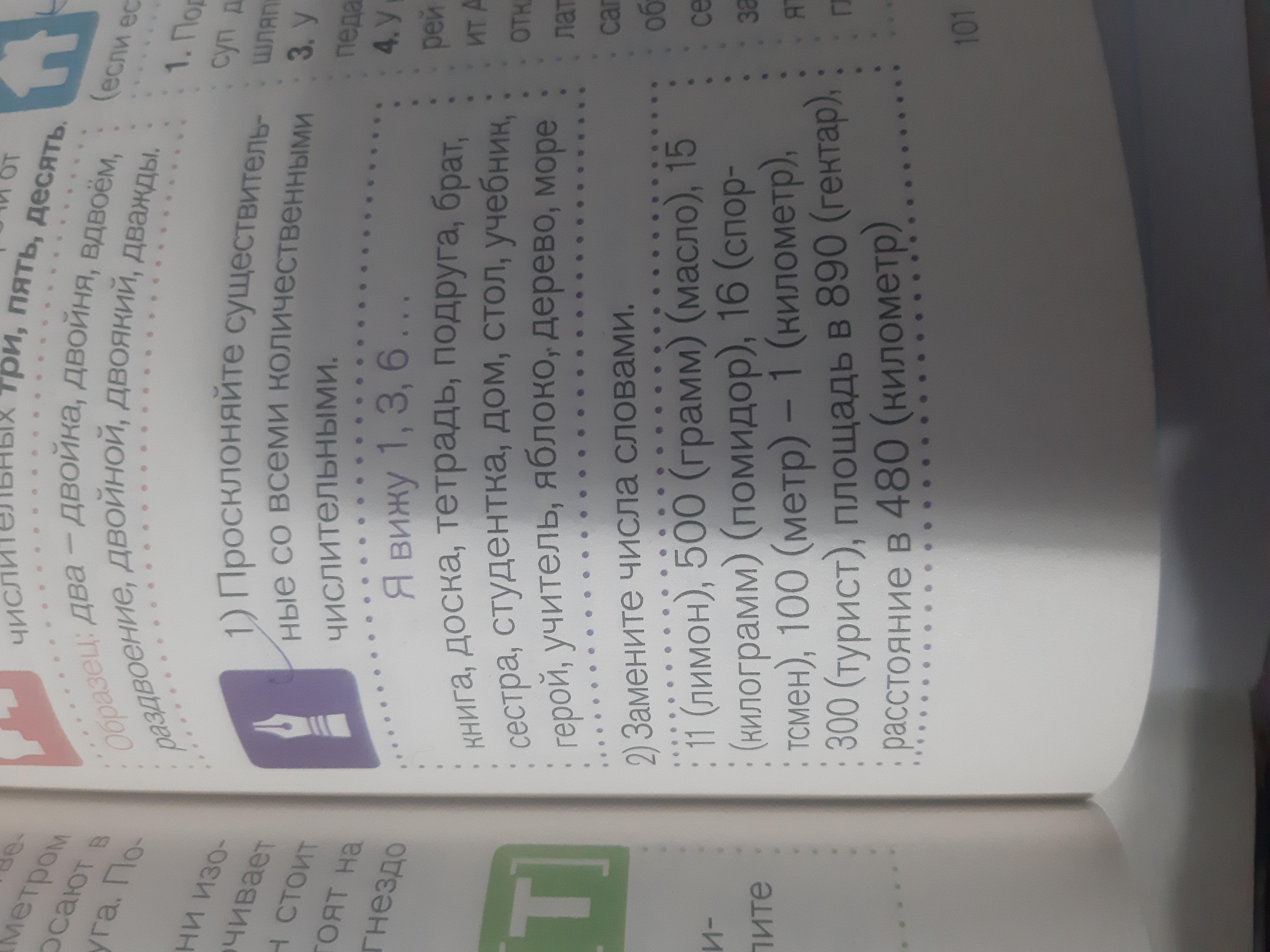 Я вижу три: книги, доски, тетради, дома,стола, учебника, яблока, дерева, моря.