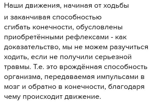 Наши движения, начиная от ходьбы и заканчивая способностью сгибать конечности, обусловлены приобретёнными рефлексами - как доказательство, мы не можем разучиться ходить, если не получили серьезной травмы. Т.е. это врождённая способность организма, передаваемая импульсами в мозг и обратно в конечности, благодаря чему происходит движение.