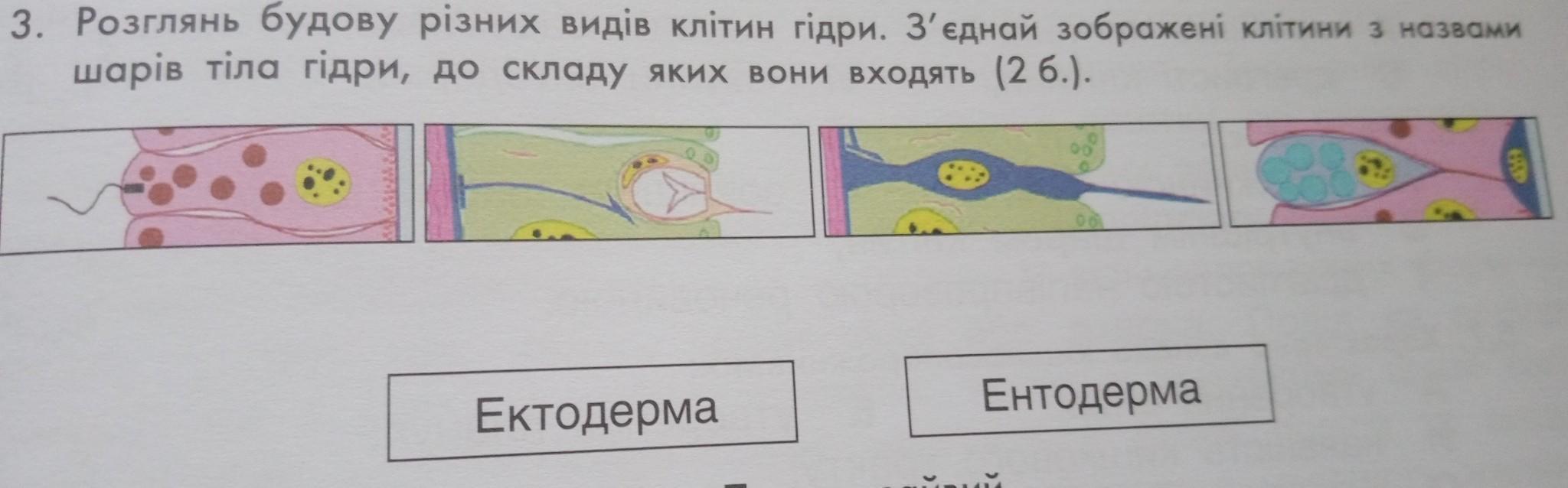6. Розглянь будову різних видів клітин гідри. З'єднай зображені клітини з назвами шарів тіла гідри, до складу яких вони входять.