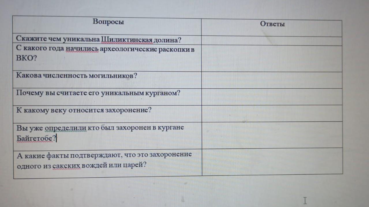 Вопросы Скажите чем уникальна Шиликтинская долина? С какого года начились археологические раскопки В Вко? Какова численность могильников? Почему вы считаете его уникальным курганом? К какому веку относится захоронение? Вы уже определили кто был захоронен в кургане Байгетобе? А какие факты подтверждают, что это захоронение одного из сакских вождей или царей? русский W Ответы - I NR 110% 40 K