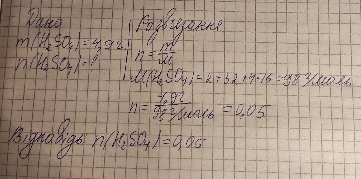 n(H2SO4) = m(H2SO4) : M(H2SO4) = 4,9 г : 98 г/моль = 0,05 моль.