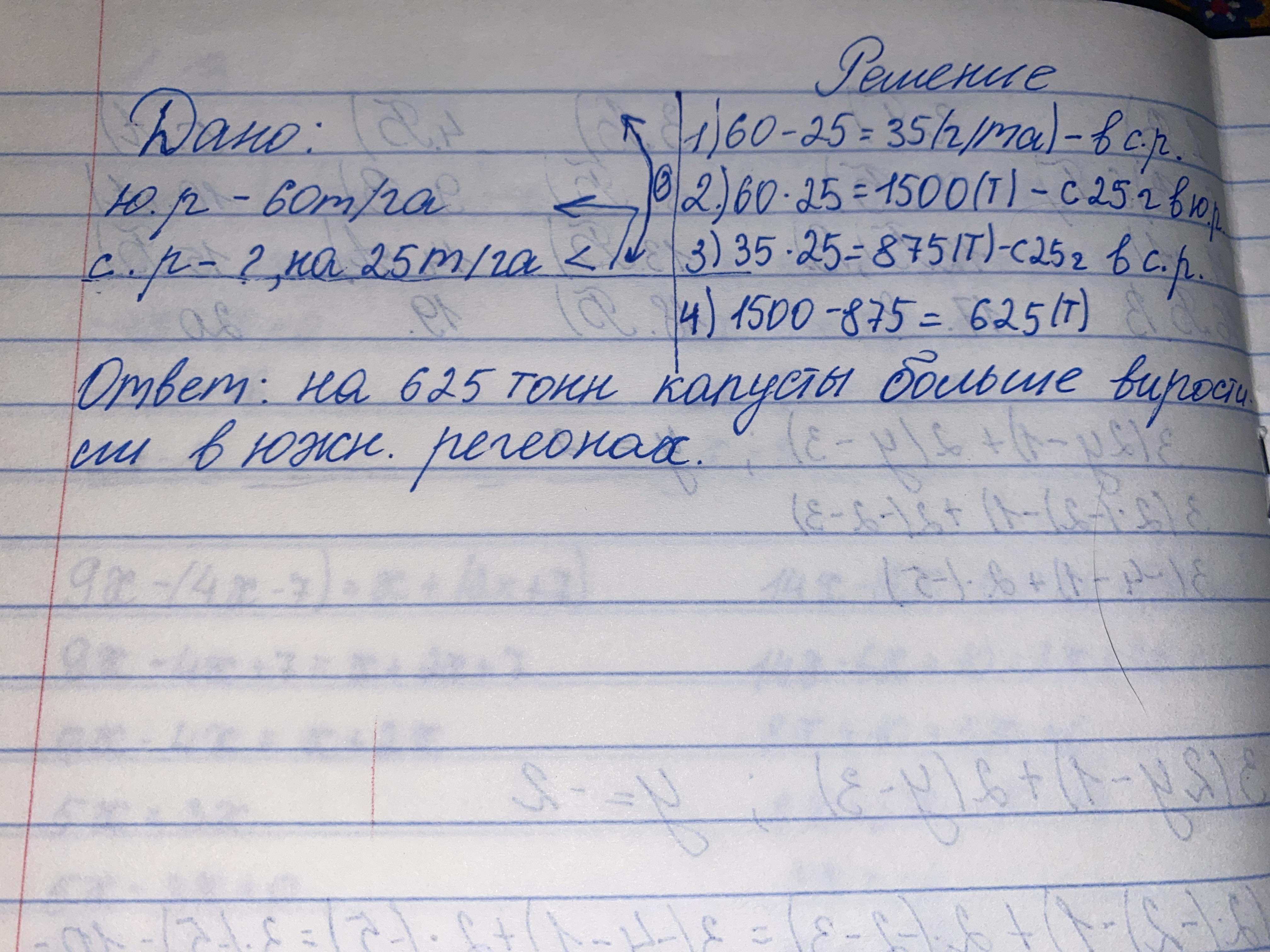 в южных регионах урожайность капусты 60т/га что на 25т/га больше урожайности в северных регионах.на сколько больше тонн капусты вырастили на площади 25т/га в южных регионах? можно фото краткой записи и решение пожалуйста,заранее спасибо дам 15 баллов