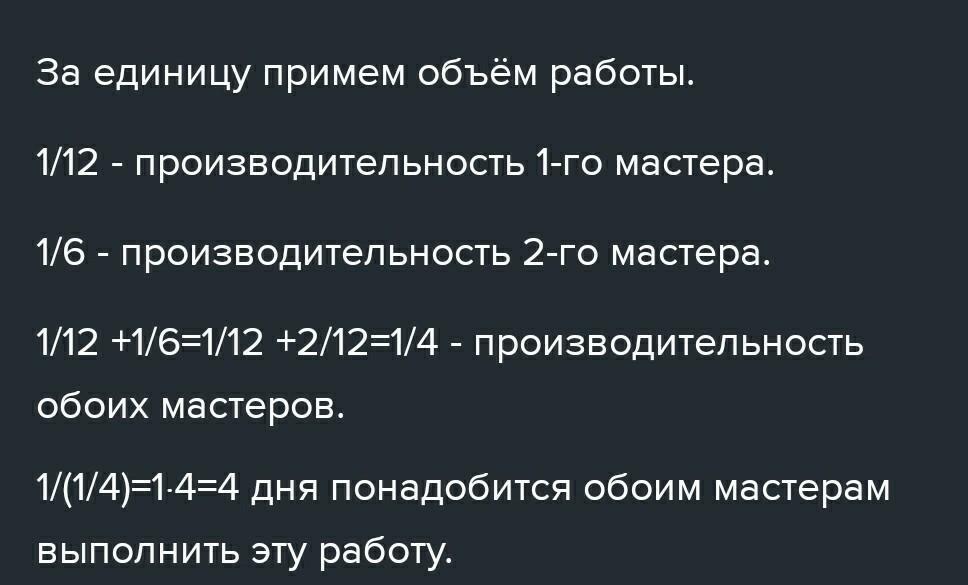 2. Первый мастер выполняет работу за 12 дней, второй мастер выполняет эту же работу за 6 дней. За сколько дней они выполнят эту работу работая вместе? пожалуйста помогите срочно . Дам 25 балов