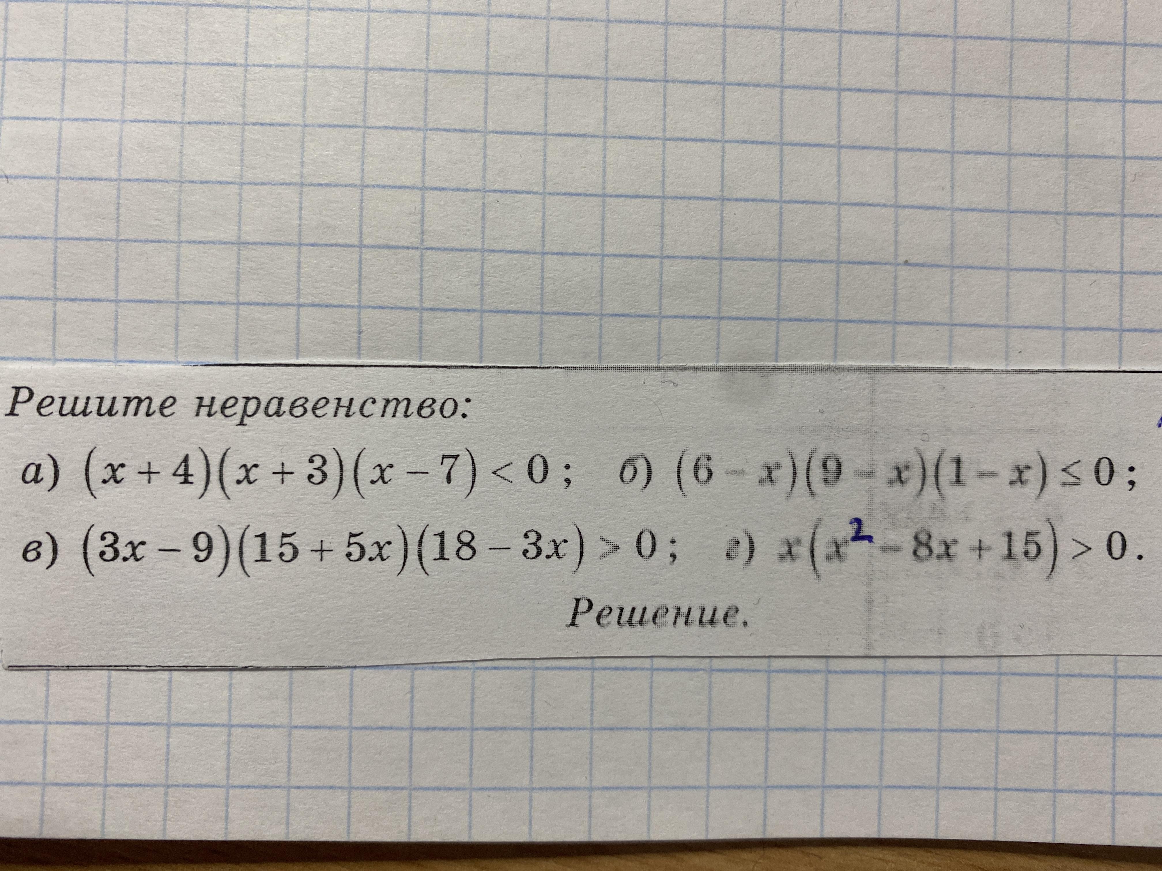 г) Чтобы найти значения x, когда функция x(x^2-8x+15) > 0, нужно найти корни функции x^2-8x+15. Корни функции равны 3 и 5. Значения x, когда функция больше нуля, это x < 0 или 0 < x < 3 или 3 < x < 5 или x > 5.