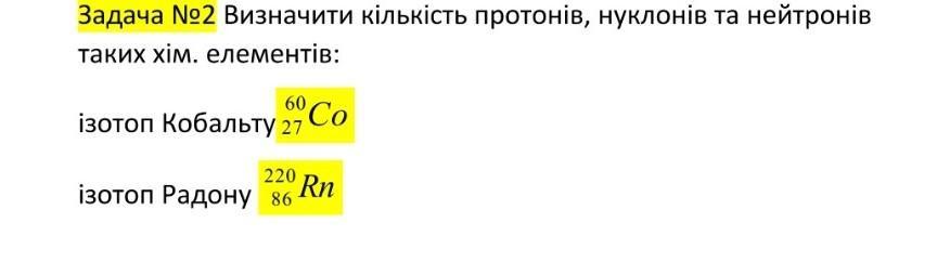 Задача №2 Визначити кількість протонів, нуклонів та нейтронів таких хім. елементів: