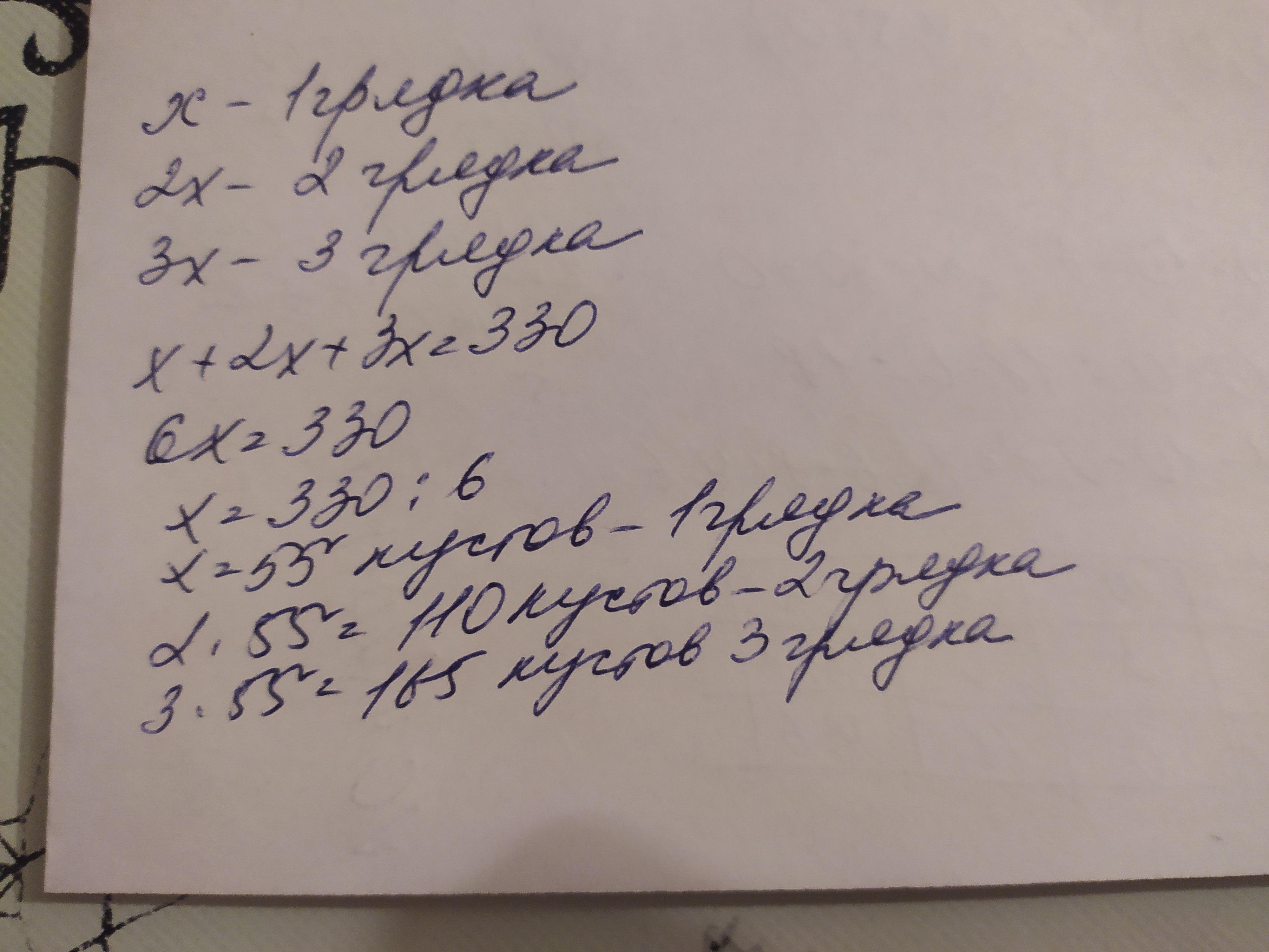 На трьох грядках росте 330 кущів перцю. На другій грядці росте вдвічі більше кущів перцю, ніж на першій, а на третій грядці - втричі більше, ніж на першій. Скільки кущів перцю росте на першій ділянці? ТЕРМІНОВО