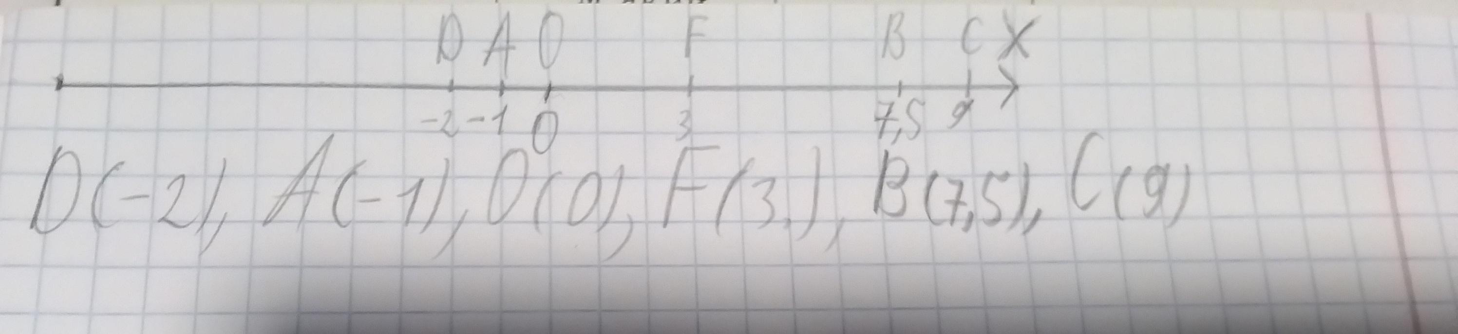 Ниже под координатной прямой которая на фото я записала координаты точек, если на фото не понятно то запишу тут: D(-2), A(-1), O(0), F(3), B(7,5), C(9).