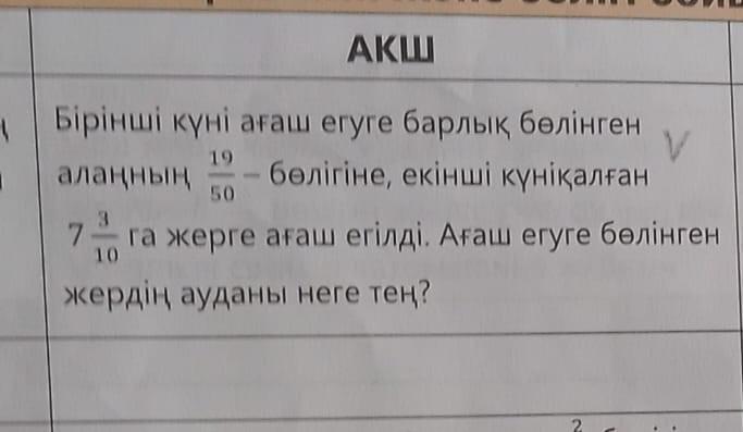 Жауабы: Ағаш егуге бөлінген жердің ауданы 7 17/25 тең