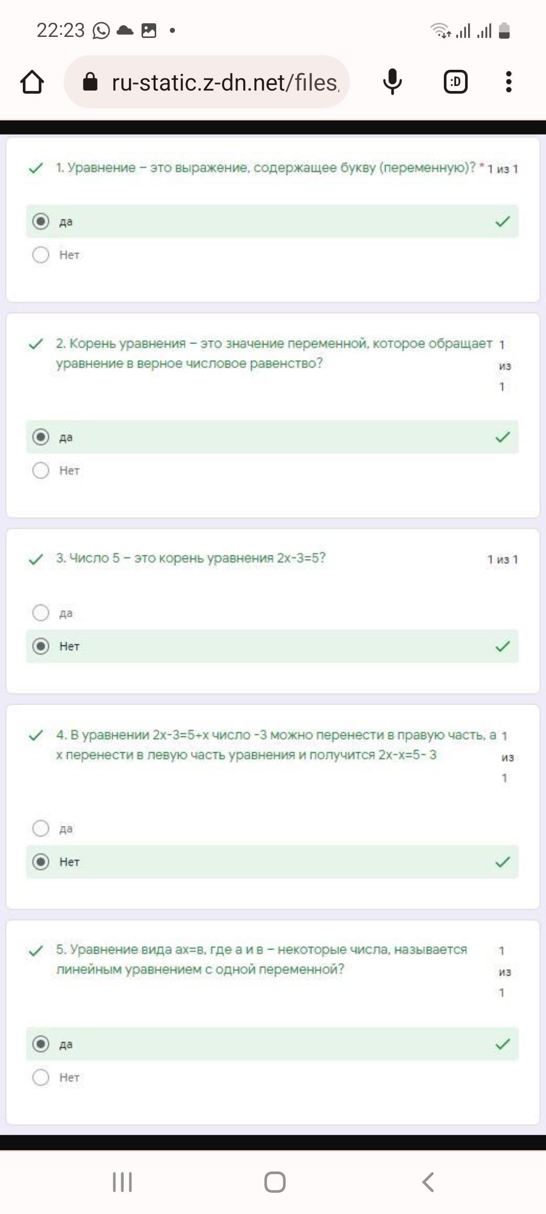 НЯ Игра > или «нет» 1.Уравнение - это выражение, содержащее букву (переменную)? 2. Корень уравнения - это значение переменной, которое обращает уравнение в верное числовое равенство? 3.Число 5-это корень уравнения 2x-3=5? 4.в уравнении 2х-3=5+х число -3 можно перенести в правую часть, а х перенести в левую часть уравнения и получится 2х- x=5-3? 5. Уравнения вида ax = b, где а и b-некоторые числа, называется линейным уравнением с одной переменной? 6. Не все уравнения являются линейными 1) -2y =4, 2) 6x-3x =2, 3) 5x-5x =0, 4) 5x= 5x+7 5) 6(x-1)= 4 x+2, 6) -x + 3= x? 1 2