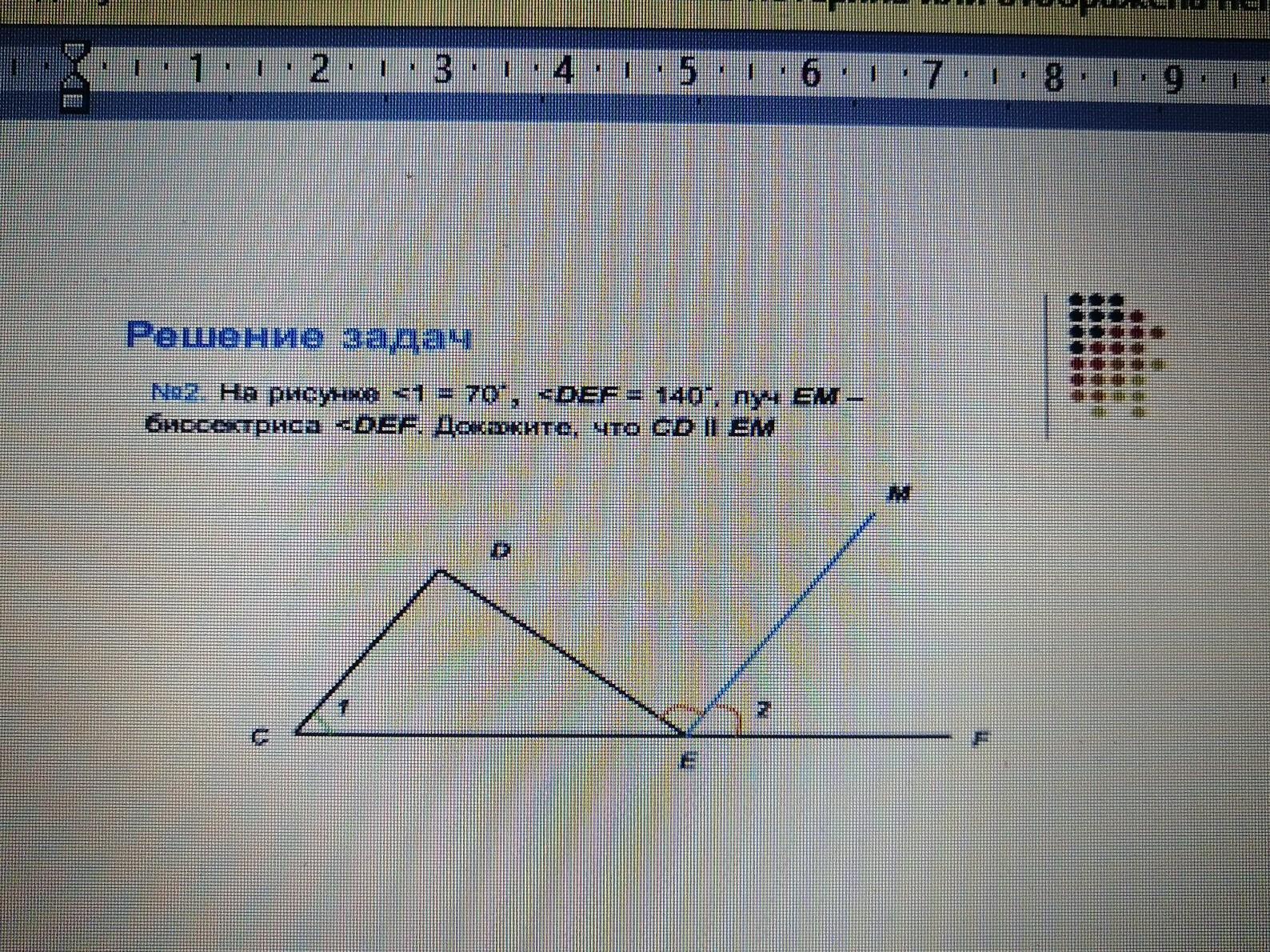 на рисунке угол один равен 70°, угол Def = 140° лучики M биссектриса угла Def Докажите что CD и параллельна em