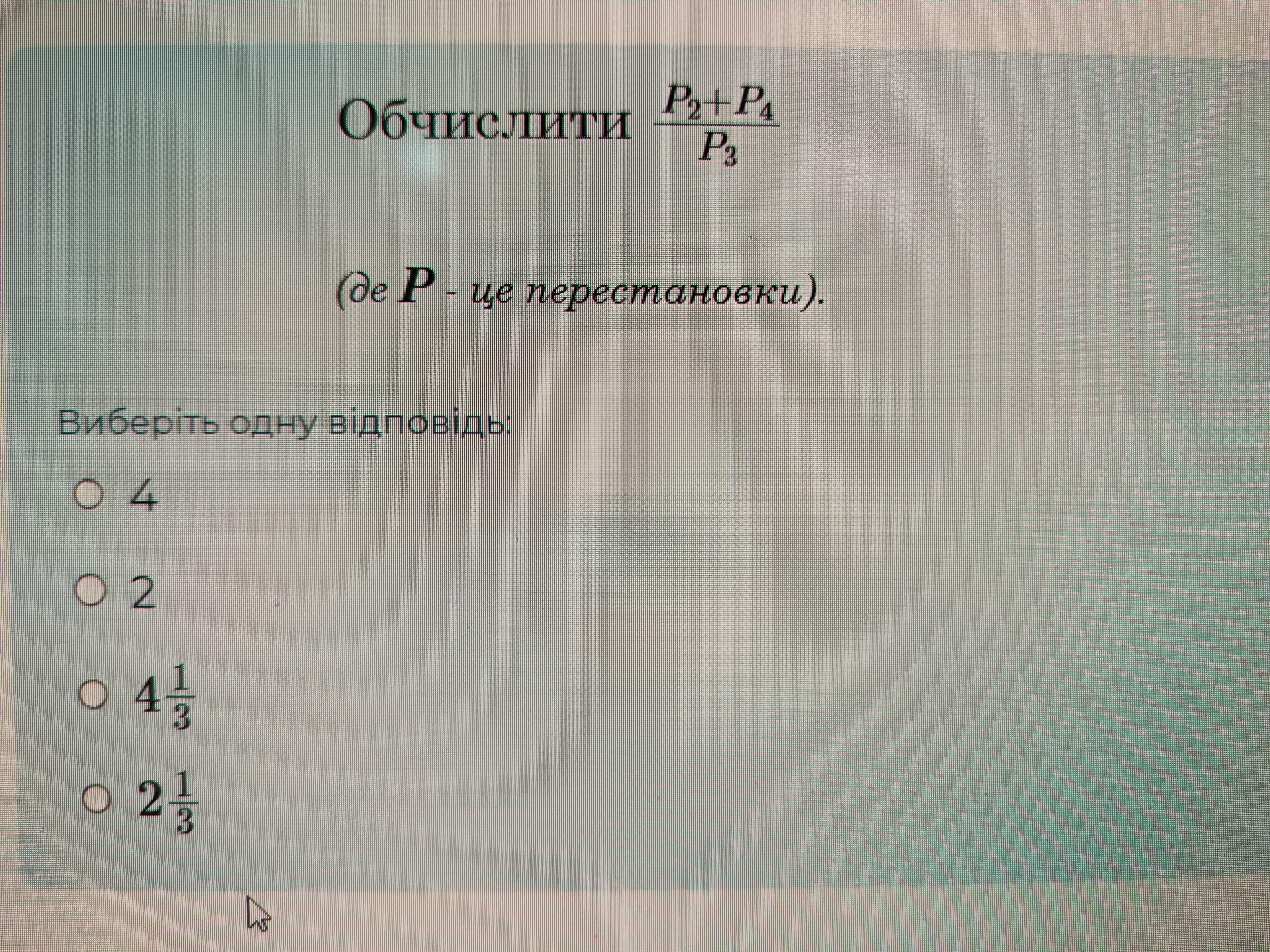 ( P₂ + P₄ )/P₃ = ( 1 * 2 + 1 * 2 * 3 * 4 )/( 1 * 2 * 3 ) = 2( 1 + 12 )/6 = 13/3 = 4 1/3.