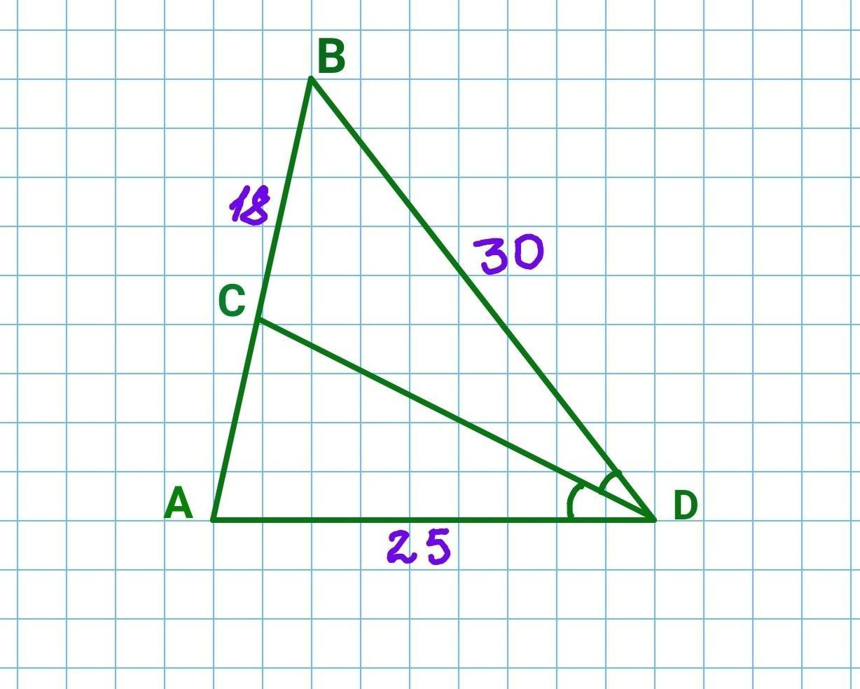 У ΔABD CD — його бісектриса. AD=25 см , ВD=30 см і CB=18см. Знайти периметр ΔABD.