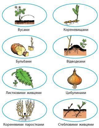 8)Стебловими живцями (відрізок пагіну з кількома бруньками) розмножують багато дерев і чагарників (тополю, вербу, смородину, троянди, аґрус), а також багаторічних декоративних (флокси) і кімнатних рослин (бальзамін, колеус, пеларгонії та ін).