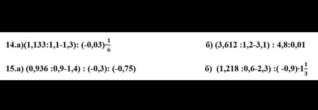 14.a)(1,133:1,1-1,3): (-0,03)/ 15.a) (0,936 :0,9-1,4): (-0,3): (-0,75) 6) (3,612 :1,2-3,1): 4,8:0,01 6) (1,218 :0,6-2,3 ) :( -0,9)-11/ можете написать по действием