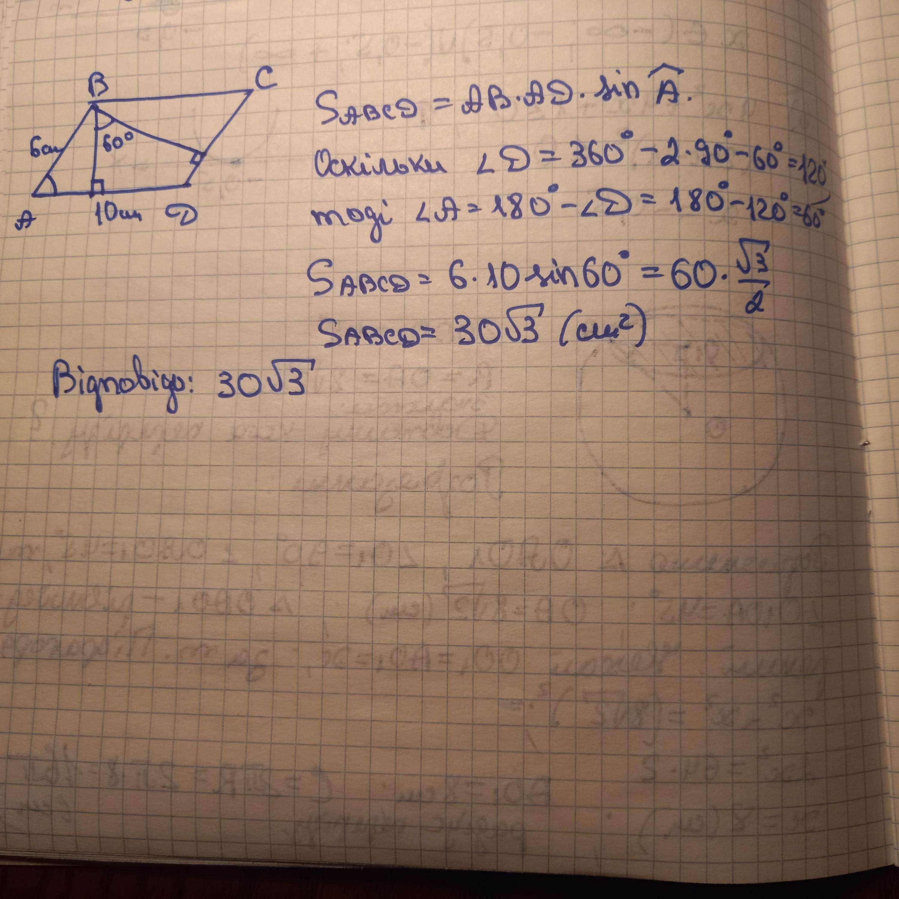 Сторони паралелограма дорівнюють 6см і 10 см, а кут між йогойого висотами, проведеними з вершини тупого кута, -60° . Знайдіть площу паралелограма. обясните ответ бистро!!!!! даю 10 минут
