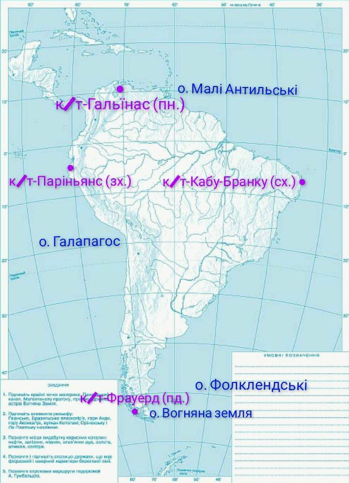 Доброго ранку. Крайні точки ● так і помичайте один у один на контурній карті, та обов'язково пишить друкованими літерами. Якщо ви задоволені буду вдячна за найкращу відповідь