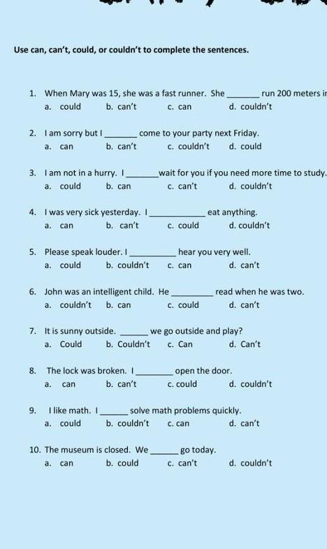 e can, can't, could, or couldn't to complete the sentences. 1. When Mary was 15, she was a fast runner. She a. could b. can't c. can 2. I am sorry but I a. can b. can't 3. I am not in a hurry. I a. could b. can 4. I was very sick yesterday. I a. can b. can't 5. Please speak louder. I_ a. could b. couldn't 7. It is sunny outside. a. Could come to your party next Friday. c. couldn't d. could 9. I like math. I a. could 6. John was an intelligent child. He a. couldn't b. can 8. The lock was broken. I_ a. can b. can't b. Couldn't c. could b. couldn't 10. The museum is closed. We a. can b. could _wait for you if you need more time to study c. can't d. couldn't c. can c. could d. couldn't hear you very well. eat anything. we go outside and play? c. Can d. couldn't c. can't run 200 meters d. can't go today. read when he was two. d. can't open the door. c. could solve math problems quickly. c. can d. Can't d. couldn't d. can't d. couldn't