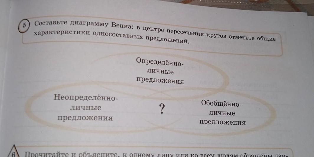 Составьте диаграмму Венна: в центре пересечения кругов отметьте общие характеристики односоставных предложений.