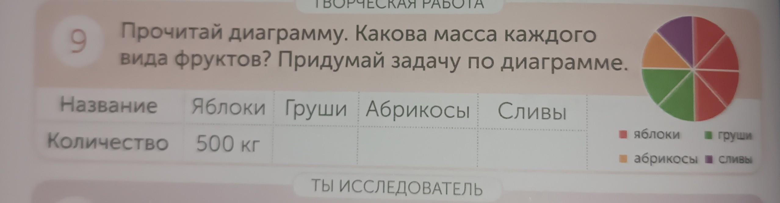 ТВОРЧЕСКАЯ РАБОТА Прочитай диаграмму. Какова масса каждого вида фруктов? Придумай задачу по диаграмме. Название Яблоки Груши Абрикосы Сливы Количество 500 кг в аблоки в з абрикосы в с составить 3 похожие задачи 20 б