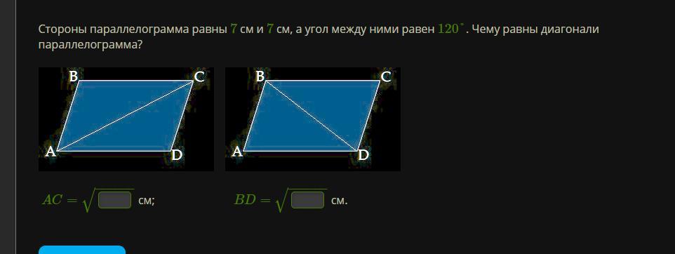 x2 =a^2+b^2 - a*b*cos(120) = 49+49-9*9*cos(120) =12.124 - большая диагональ АС