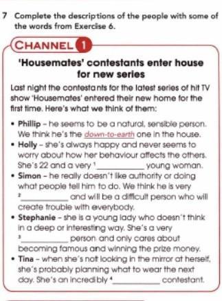 7 Complete the descriptions of the people with some of the words from Exercise 6. CHANNEL 1 'Housemates' contestants enter house for new series Last night the contestants for the latest series of hit TV show 'Housemates' entered their new home for the first time. Here's what we think of them: • Phillip - he seems to be a natural, sensible person. We think he's the down-to-earth one in the house. • Holly - she's always happy and never seems to worry about how her behaviour affects the others. She's 22 and a very¹__ young woman. • Simon - he really doesn't like authority or doing what people tell him to do. We think he is very 2 and will be a difficult person who will create trouble with everybody, Stephanie - she is a young lady who doesn't think in a deep or interesting way. She's a very 3 person and only cares about becoming famous and winning the prize money. • Tina - when she's not looking in the mirror at herself, she's probably planning what to wear the next day. She's an incredibly contestant. SHOW WHAT YOU'VE LEARNT