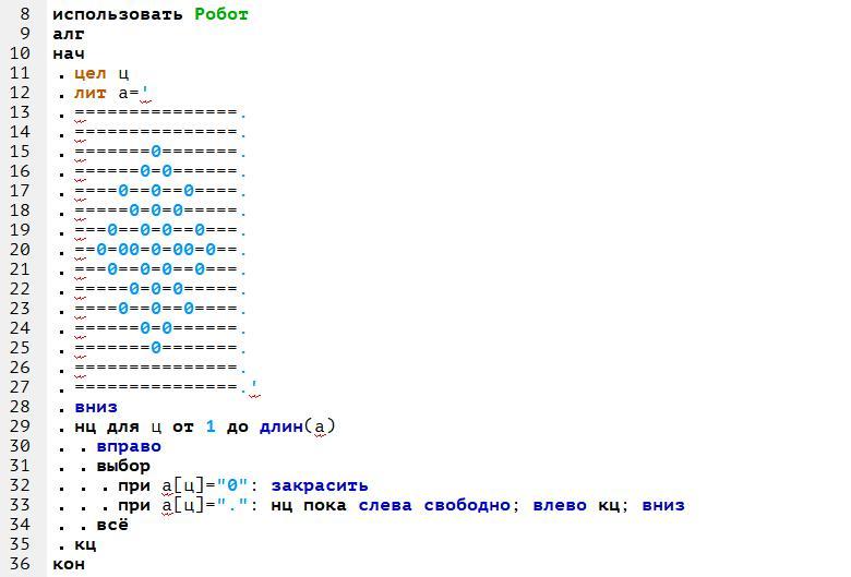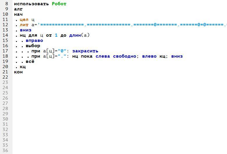 при а[ц]=".": нц пока слева свободно; влево кц; вниз