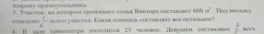 участок на котором проживает семья Виктора составляет 600 м² под посадку отведено 1/6 всего участка Какая площадь составляет всё остальное пожалуйста срочно нужно ответьте пожалуйста номер 3