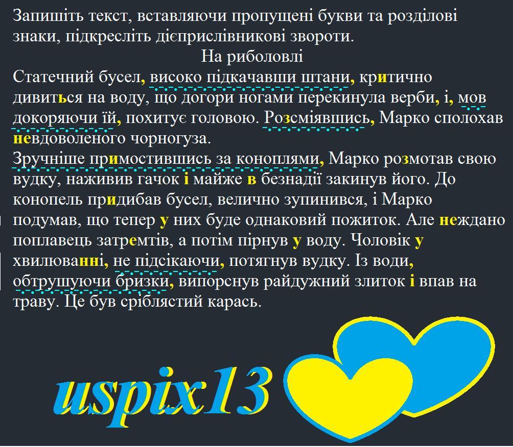 Зручніше пр...мостившись за коноплями Марко ро..мотав свою вудку, наживив гачок (і,й) майже (в, у) безнадії закинув його. До конопель пр..дибав бусел, велично зупинився, і Марко подумав, що тепер (у, в) них буде однаковий пожиток. Але (не)ждано поплавець затр..мтів, а потім пірнув (у, в) воду. Чоловік (у, в) хвилюва(н,нн)і не підсікаючи потягнув вудку. Із води обтрушуючи бризки випорснув райдужний злиток (і,й) впав на траву. Це був сріблястий карась.