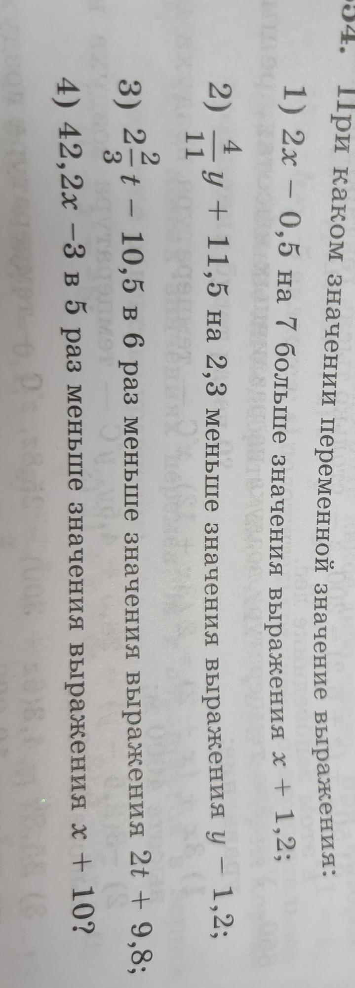 854. При каком значении переменной значение выражения: 1) 2x - 0,5 на 7 больше значения выражения х + 1,2; - ВКУ 2) 4у + 11,5 на 2,3 меньше значения выражения у - 1,2; 11 3) 23t - 10,5 в 6 раз меньше значения выражения 2t + 9,8; 6 4) 42,2х -3 в 5 раз меньше значения выражения х + 10? 0's.8,