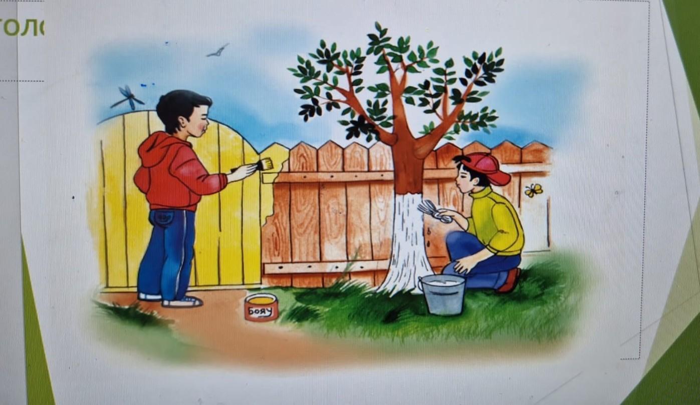 Жолдас пен Али даланы жинап жатыр.Жолдас ағаштарды оқ түспен бояуды шешті. Ал Али дарбазаны сары түске бояуды жөн көрді.Олар біткен соң дала өте жынақы және әдемі болды.Әкесіне өте ұнады. олар