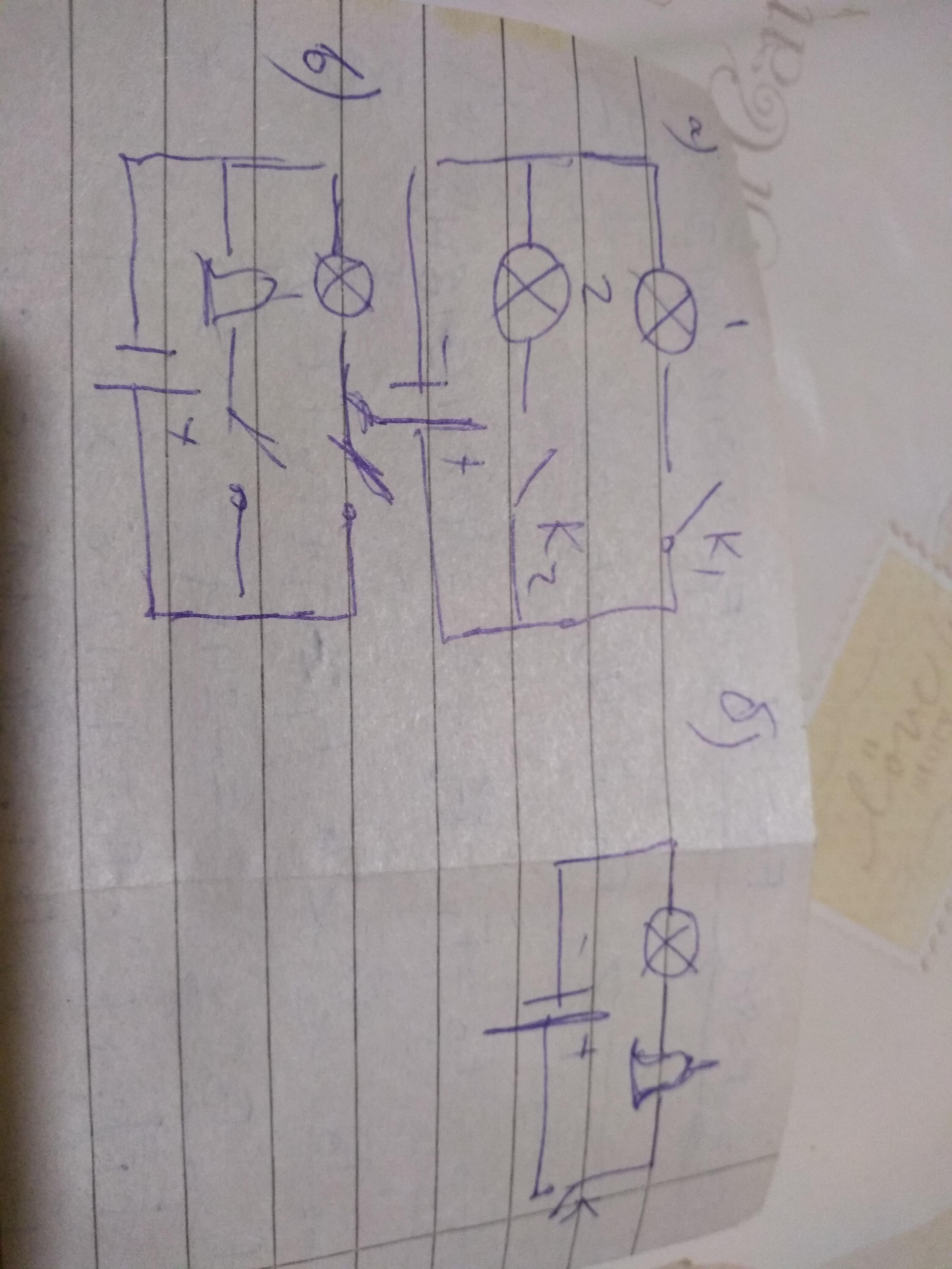 Изобрази цепь, состоящую из источника двух ламп, двух ключей, так, чтобы ключи включали лампы по отдельности. Изобрази цепь, состоящую из источника, лампы, звонка, ключа, так чтобы ключ включал звонок и лампу вместе. Изобрази цепь, состоящую из источника, лампы, звонка, ключей, так чтобы ключи включали звонок и лампу по отдельности.