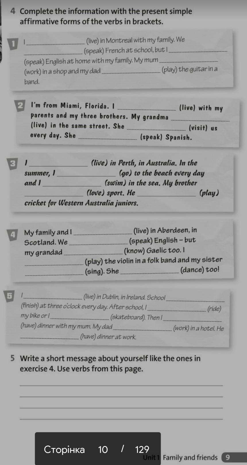 6. I live in (твой город), in Ukraine. I like dogs and really want one. But my mom wants cat. After school I go home and do my homework. Then I watch TV with my family. My dad likes drama movies, but I prefer serials.