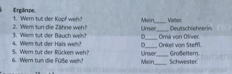 Ergänze. 1. Wem tut der Kopf weh? 2. Wem tun die Zähne weh? 3. Wem tut der Bauch weh? 4. Wem tut der Hals weh? 5. Wem tut der Rücken weh? 6. Wem tun die Füße weh? Mein Unser Vater. Deutschlehrerin. DOma von Oliver. DOnkel von Steffi. Unser Großeltern. Mein Schwester.