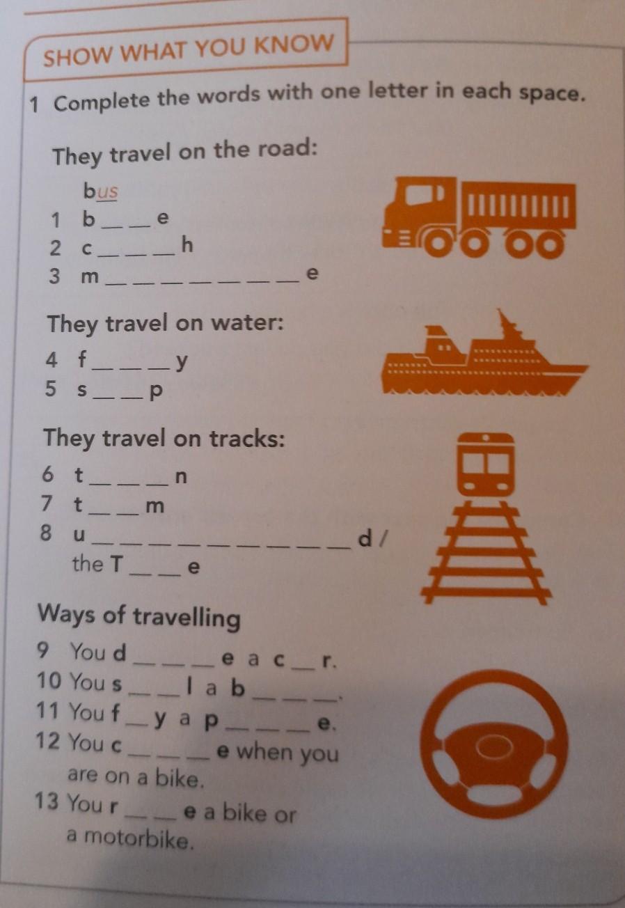 SHOW WHAT YOU KNOW 1 Complete the words with one letter in each space. They travel on the road: bus 1 b__e 2 c 3 m _h They travel on water: 4 f_ __Y 5 SP They travel on tracks: 6 t 7 t__m 8 u the T- n Ways of travelling 9 You d 10 You sI ab. 11 You f_y a p_- 12 You c e _d/ e ac_r. are on a bike. 13 You re a bike or a motorbike. _e when you
