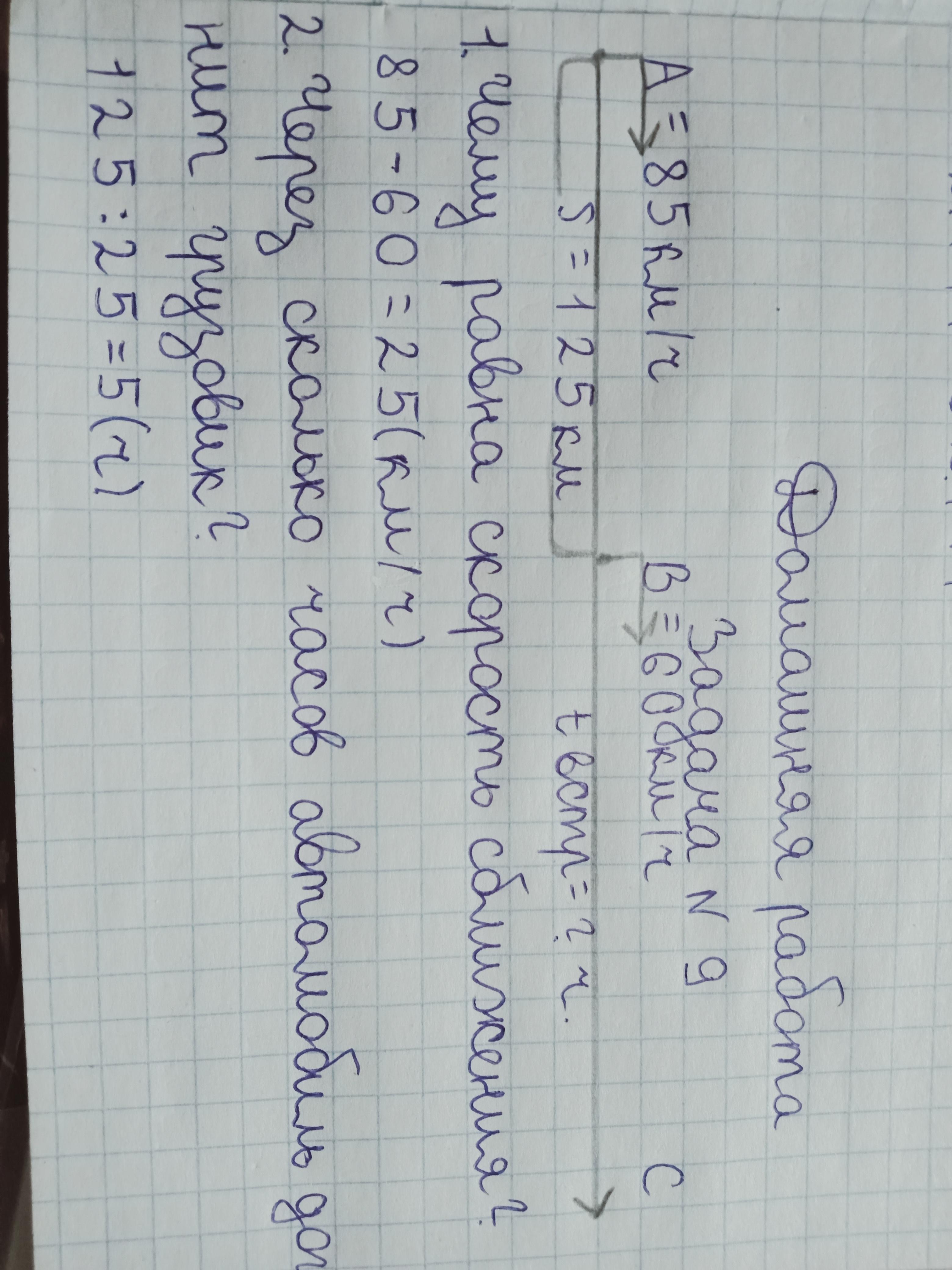 1. Чему равна скорость сближения? 85-60=25 (км/ч)