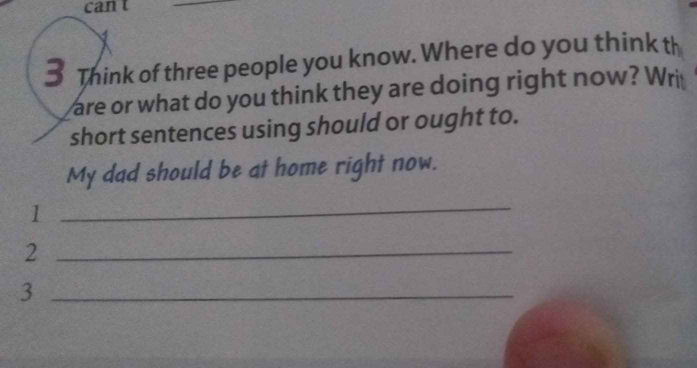 3 Think of three people you know. Where are or what do you think they are doing short sentences using should or ought to My dad should be at home right now.