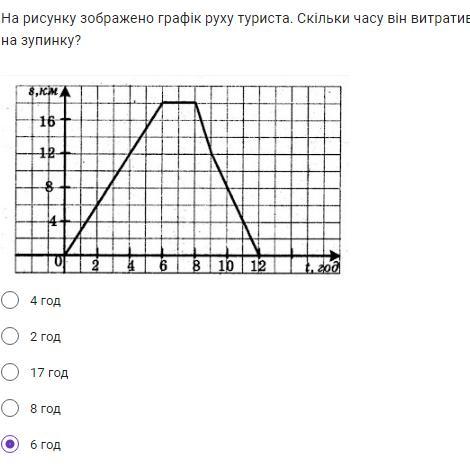 З 6-му по 8-му годину шлях залишився той самий, отже, турист не рухався. Час з 6-ї по 8-му – 2 години