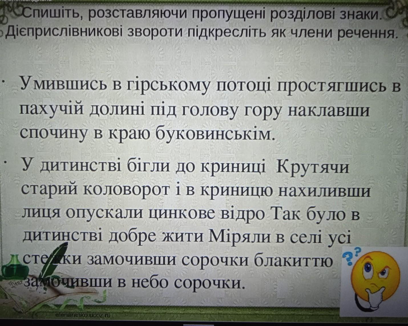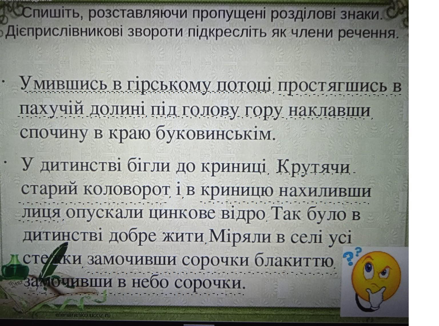 Спишіть , розставляючи пропущені розділові знаки. Дієприслівникові звориьи підкресліть як члени речення.