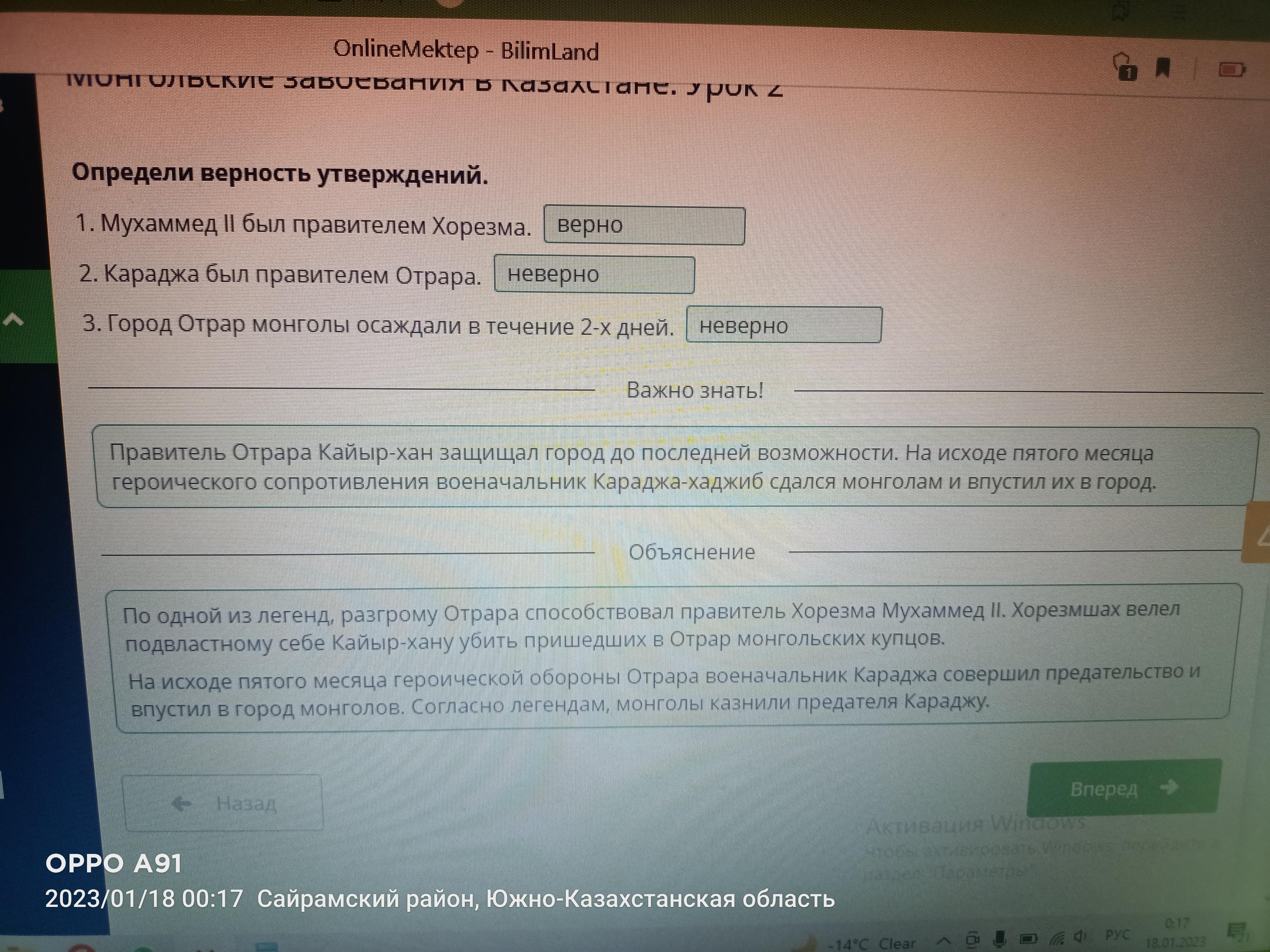 Определи верность утверждений. 1. Мухаммед II был правителем Хорезма. 2. Караджа был правителем Отрара. 3. Город Отрар монголы осаждали в течение 2-х дней.