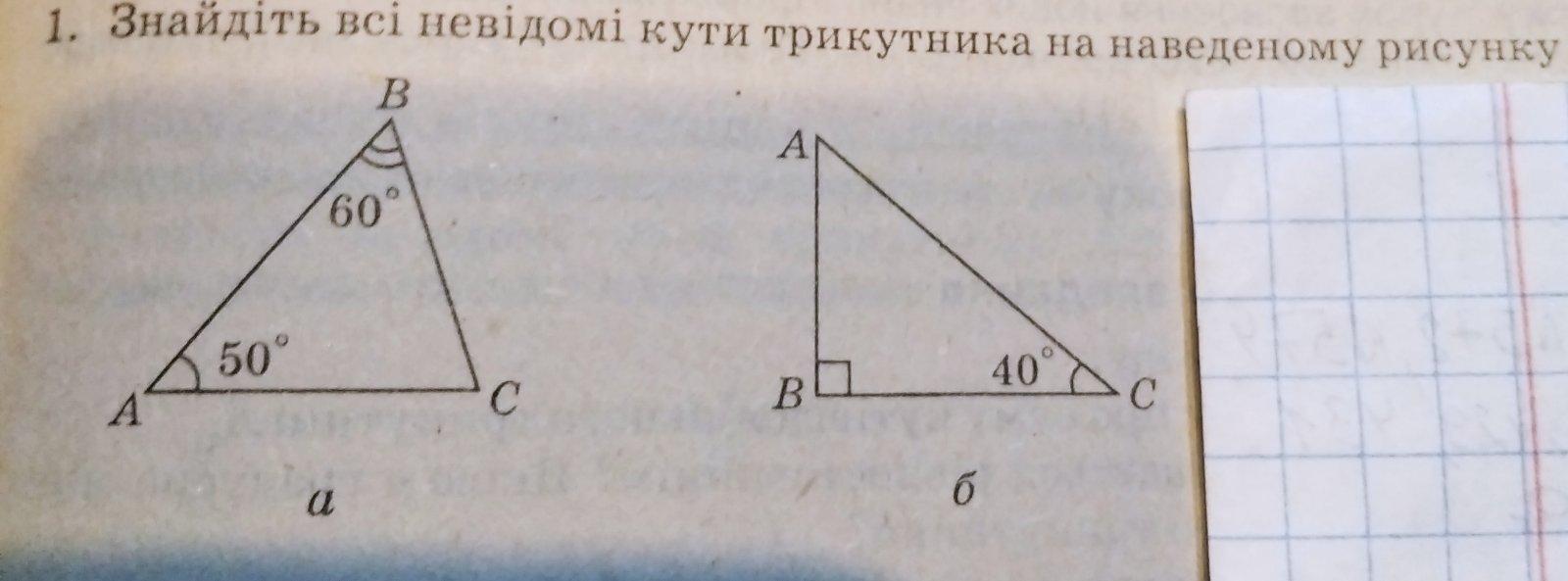 У трикутнику на малюнку а кут С дорівнює 70градусів, а на малюнку б кут В дорівнює 90 градусів бо він прямий отже кут А дорівнює 50градусів
