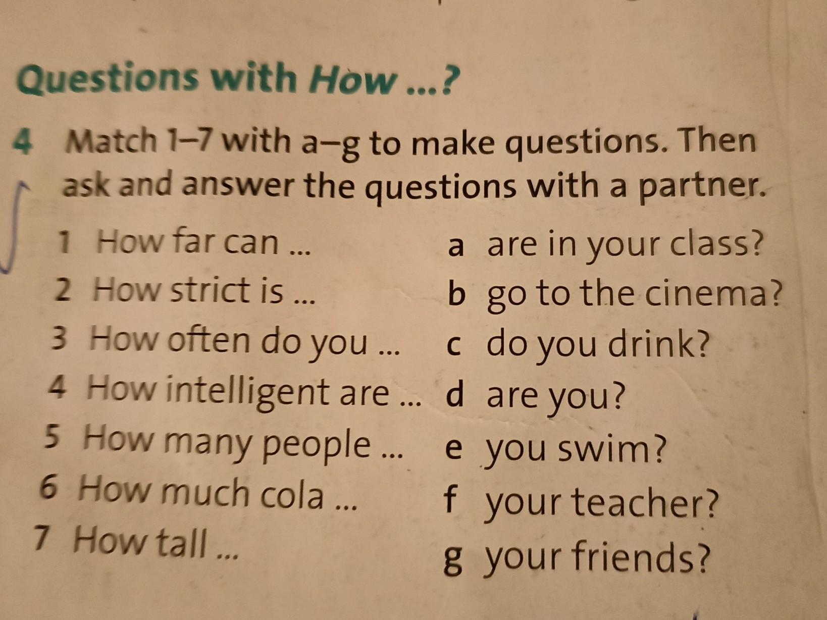 Questions with How ...? 4 Match 1-7 with a-g to make questions. Then ask and answer the questions with a partner. 1 How far can... 2 How strict is 3 How often do you ... 4 How intelligent are ... 5 How many people... 6 How much cola ... 7 How tall ... b a are in your class? go to the cinema? c do you drink? d are you? e you swim? f your teacher? g your friends?