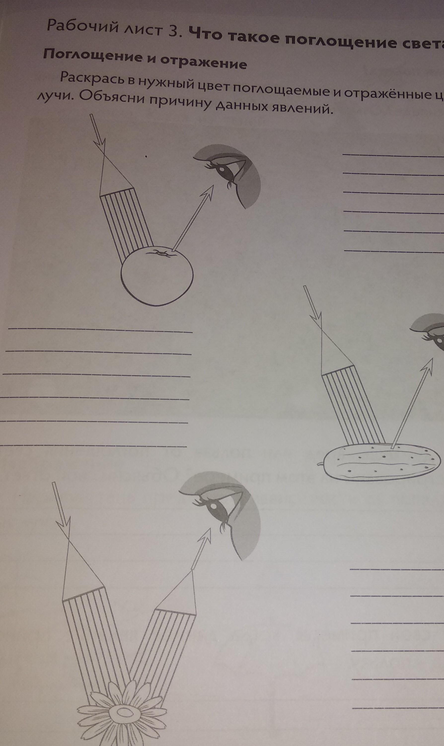 Раскрась нужный цвет поглощаемые и отраженные цветовые лучи Объясни причину данных явлений