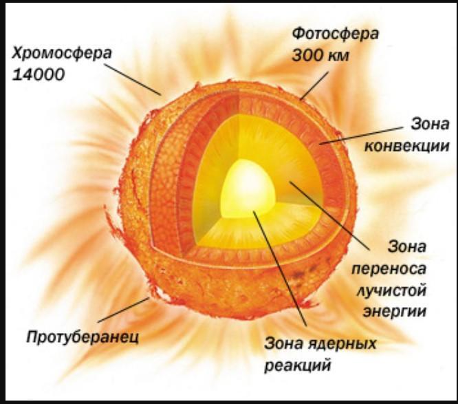 Будова Сонця: фотосфера, хромосфера, корона, конвективна зона, ядро.